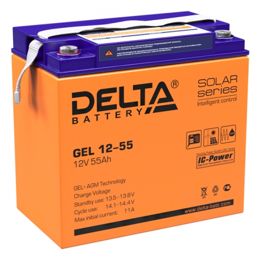 Delta GEL 12-55 - герметизированные, необслуживаемые свинцово-кислотные аккумуляторы серии GEL изготовлены по технологии AGM+GEL: combined AGM and GEL technology. Это современное технологическое решение, сочетающее в себе специализированные AGM сепараторы, с частичным сгущением электролита, для получения двойного преимущества: высоких разрядных характеристик, присущих AGM технологии, и высокой эксплуатационной устойчивости, которая характерна для аккумуляторов, изготовленных по технологии AGM+GEL. Аккумуляторы предназначены для работы как в буферном, так и в циклическом режимах. Рекомендуются для применения в автономных энергосистемах, а также совместно с системами на базе альтернативных источников энергии.
