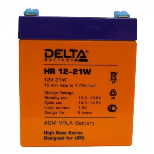 Delta HR 12-21W - аккумулятор обладает повышенной энергоотдачей благодаря более толстым пластинам, а также использованию более чистых составов свинца.