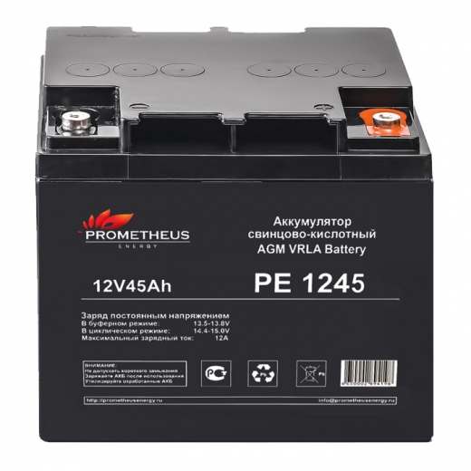 Свинцово-кислотные аккумуляторы Prometheus Energy PE1245 являются ярким примером герметизированных, необслуживаемых батарей с системой рекомбинации газов (VRLA), произведенных по AGM технологии (электролит, абсорбированный в стекловолоконном сепараторе). Аккумулятор имеет емкость 45Ah.