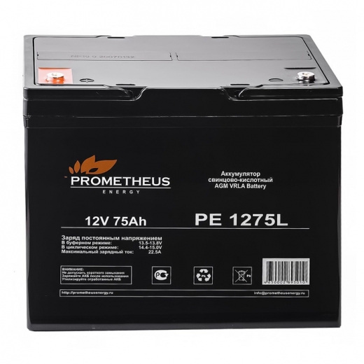Свинцово-кислотные аккумуляторы Prometheus Energy PE1275L являются ярким примером герметизированных, необслуживаемых батарей с системой рекомбинации газов (VRLA), произведенных по AGM технологии (электролит, абсорбированный в стекловолоконном сепараторе). Аккумулятор имеет емкость 75Ah.