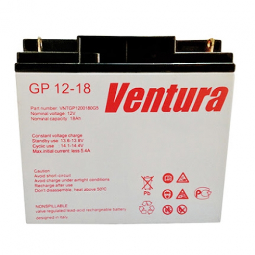 Аккумулятор Ventura GP 12-18 предназначен для комплектования батарей, используемых в источниках бесперебойного питания, охранно-пожарных системах, системах связи и телекоммуникаций. Герметизирован, не нуждается в обслуживании и доливе воды. Возможен монтаж в горизонтальном и вертикальном положении (установка на крышку не допускается). Рекомендованный срок использования – 6 лет.