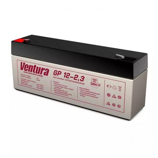 Аккумулятор Ventura GP 12-2,3 предназначен для комплектования батарей, используемых в источниках бесперебойного питания, охранно-пожарных системах, системах связи и телекоммуникаций. Герметизирован, не нуждается в обслуживании и доливе воды. Возможен монтаж в горизонтальном и вертикальном положении (установка на крышку не допускается). Рекомендованный срок использования – 6 лет.