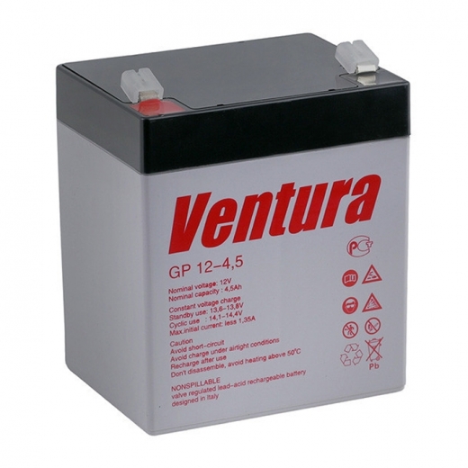 Аккумулятор Ventura GP 12-4.5 предназначен для комплектования батарей, используемых в источниках бесперебойного питания, охранно-пожарных системах, системах связи и телекоммуникаций. Герметизирован, не нуждается в обслуживании и доливе воды. Возможен монтаж в горизонтальном и вертикальном положении (установка на крышку не допускается). Рекомендованный срок его использования – 6 лет..