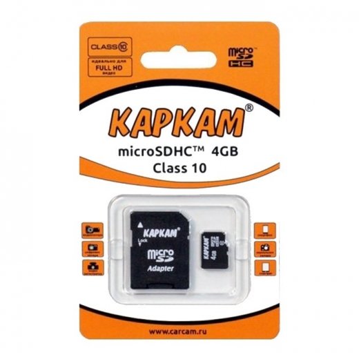 Каркам 4GB microSDHC 10Class UHS-I - карта памяти на 4 Гб, созданная для бесперебойной работы в видеорегистраторах Каркам. Данные карты памяти идеально подходят для записи FULL HD видео и больших массивов данных, т.к. обладают классом записи 10, что позволяет минимизировать задержки в работе видеорегистратора, избежать зависаний и потери данных.