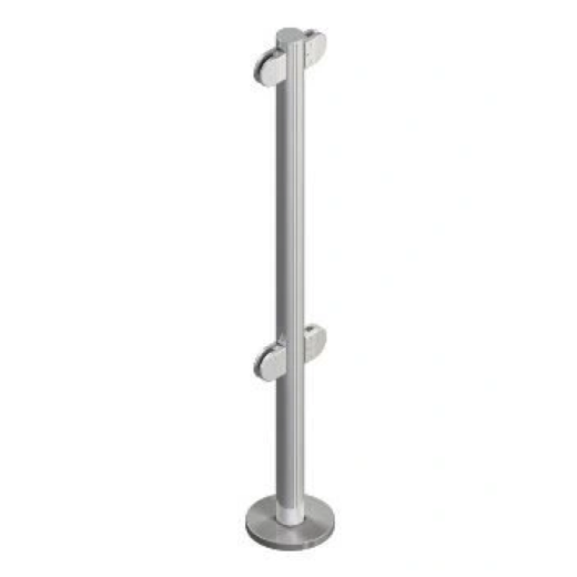 Стойка 1000 мм из 48 мм нержавеющей трубы (AISI 304) на фланце, ЧЕТЫРЕ зажима под углом 180 градусов установлены для стекол с закругленными углами радиусом R=5 мм. Расстояние между зажимами по вертикали 600 мм