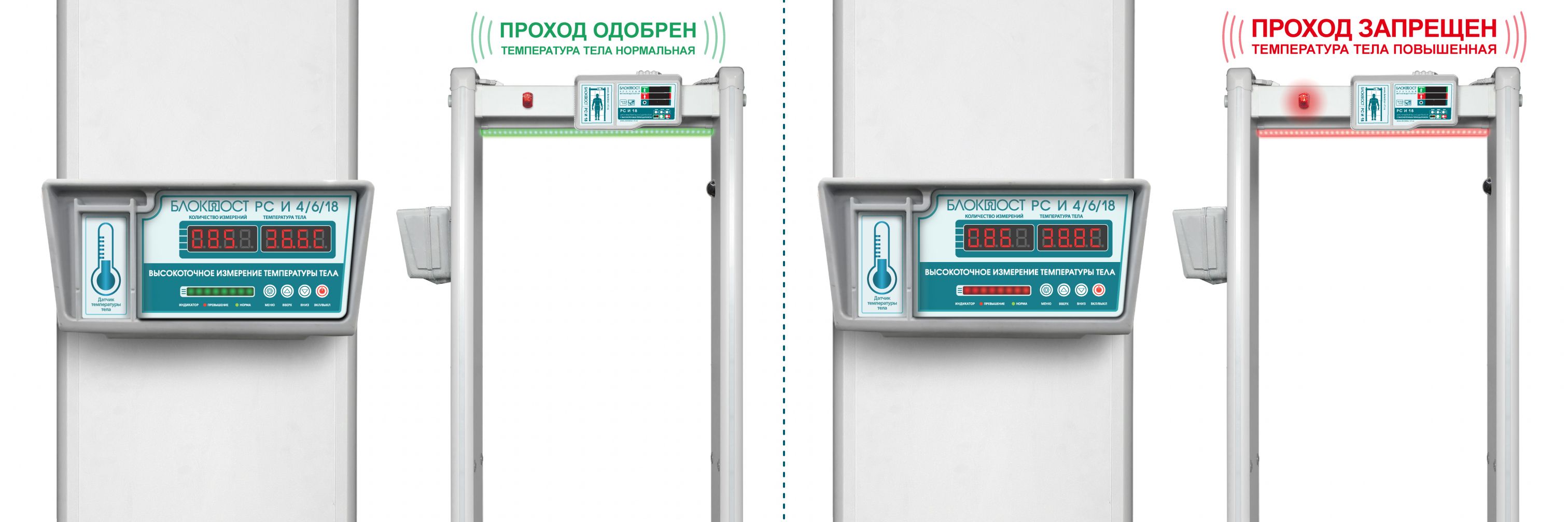 Компания «БЛОКПОСТ» рада представить новую модель арочного металлодетектора БЛОКПОСТ РС И 18 с бесконтактным, высокоточным пирометром. Данная модель металлодетектора предназначена не только для досмотра посетителей и выявления, запрещенных к проносу металлических изделий, но и для измерения температуры тела входящего в рамку человека в потоковом режиме с выдачей сигнала тревоги в случае превышения установленного предельного значения. Сигналы наличия металлических предметов и превышения температуры могут быть различными по тональности и громкости, кроме того различны и световые сигналы. Служба безопасности без труда определит, какой из показателей превышен. РС И 18 с пирометром, как и все металлодетекторы Блокпост последнего поколения, обладает эталонной чувствительностью и помехозащищенностью и способен отличать бытовые металлические предметы от запрещенных к проносу.