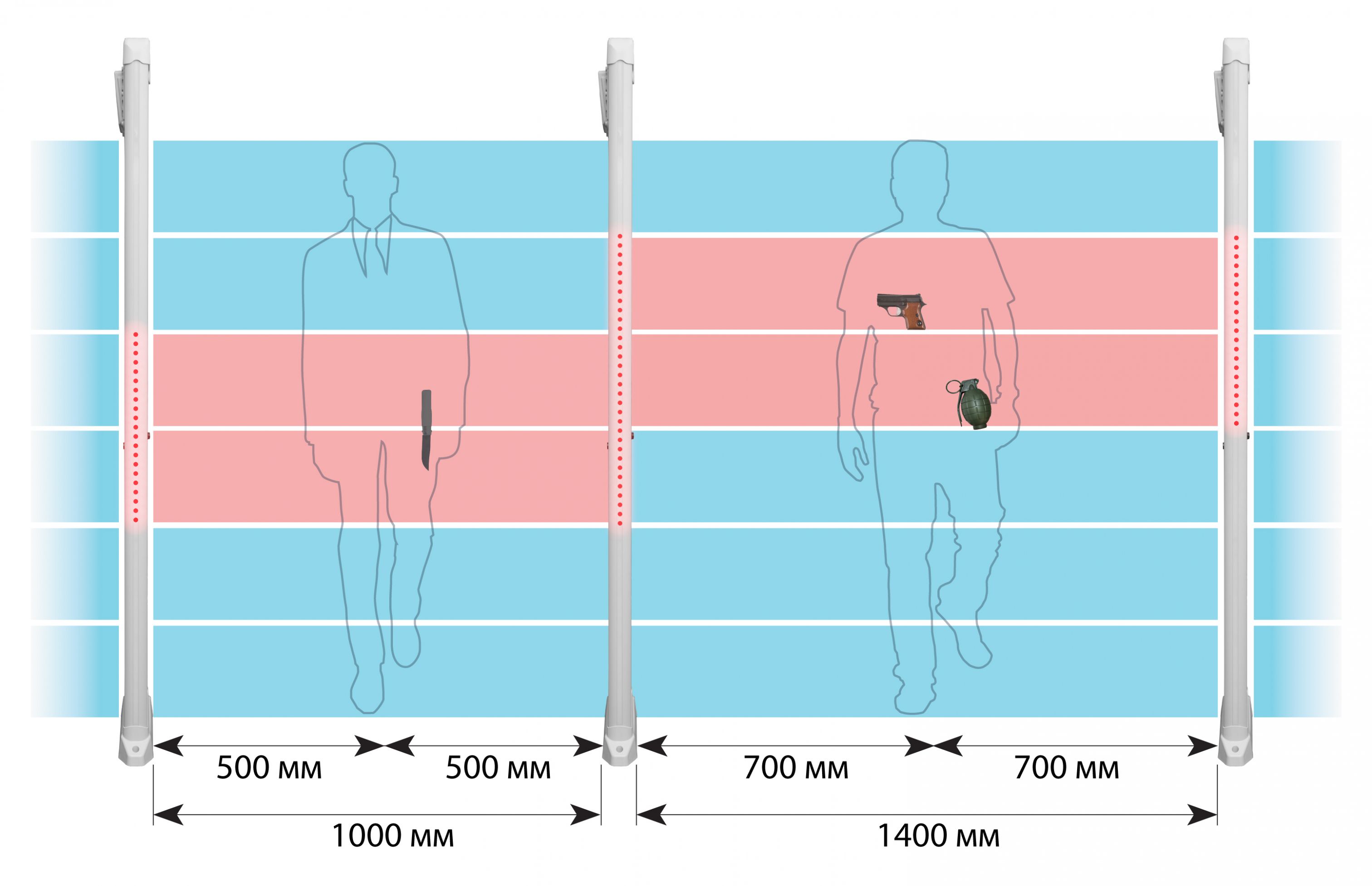 При обустройстве входной группы зоной безопасности детекторы БЛОКПОСТ M Z 6 M K можно устанавливать как параллельно друг другу в одну линию, так и ступенчато. Расстояние между устройствами может изменяться в зависимости от параметров чувствительности монопанелей. В настройках данной серии имеется возможность выставить индивидуальную рабочую частоту (Рч) для каждого устройства, чтобы избежать помех от стоящих рядом детекторов. В случае установки большого количества монопанелей в одном месте, рабочая частота подбирается автоматически. Минимально-приемлемое расстояние между детекторами определяется исходя из условий на месте установки.