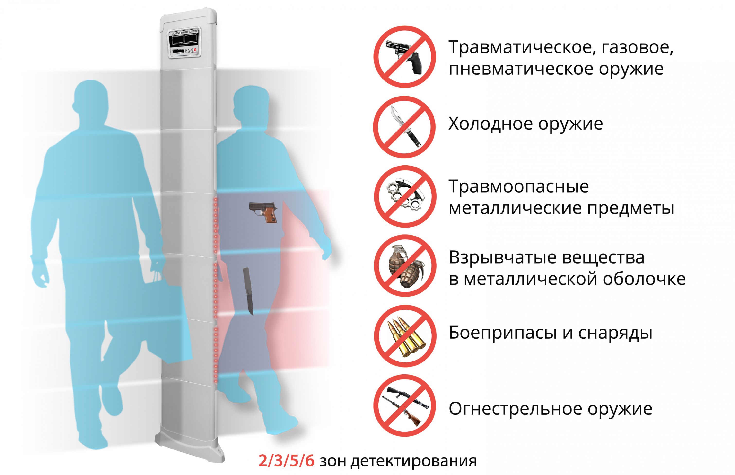 Сборно-разборная модель металлодетектора состоит из 7-ми отдельных частей, которые соединяются между собой по принципу пазла. В зависимости от внешних факторов и условий охраняемых территорий, можно установить подходящее количество зон детектирования: 2, 3, 5 или 6 рабочих зон, также в настройках монопанели M X 6 M K выставляются параметры запрещенных предметов (вес, объем, размер), регулировка чувствительности. Современное аналоговое оборудование работает за счёт электромагнитных волн. Известный факт, что металлические предметы не пропускают через себя электроволны. Следовательно, когда происходит пронос несанкционированных предметов через досмотровую зону, металлодетектор незамедлительно реагирует световой и звуковой индикацией.