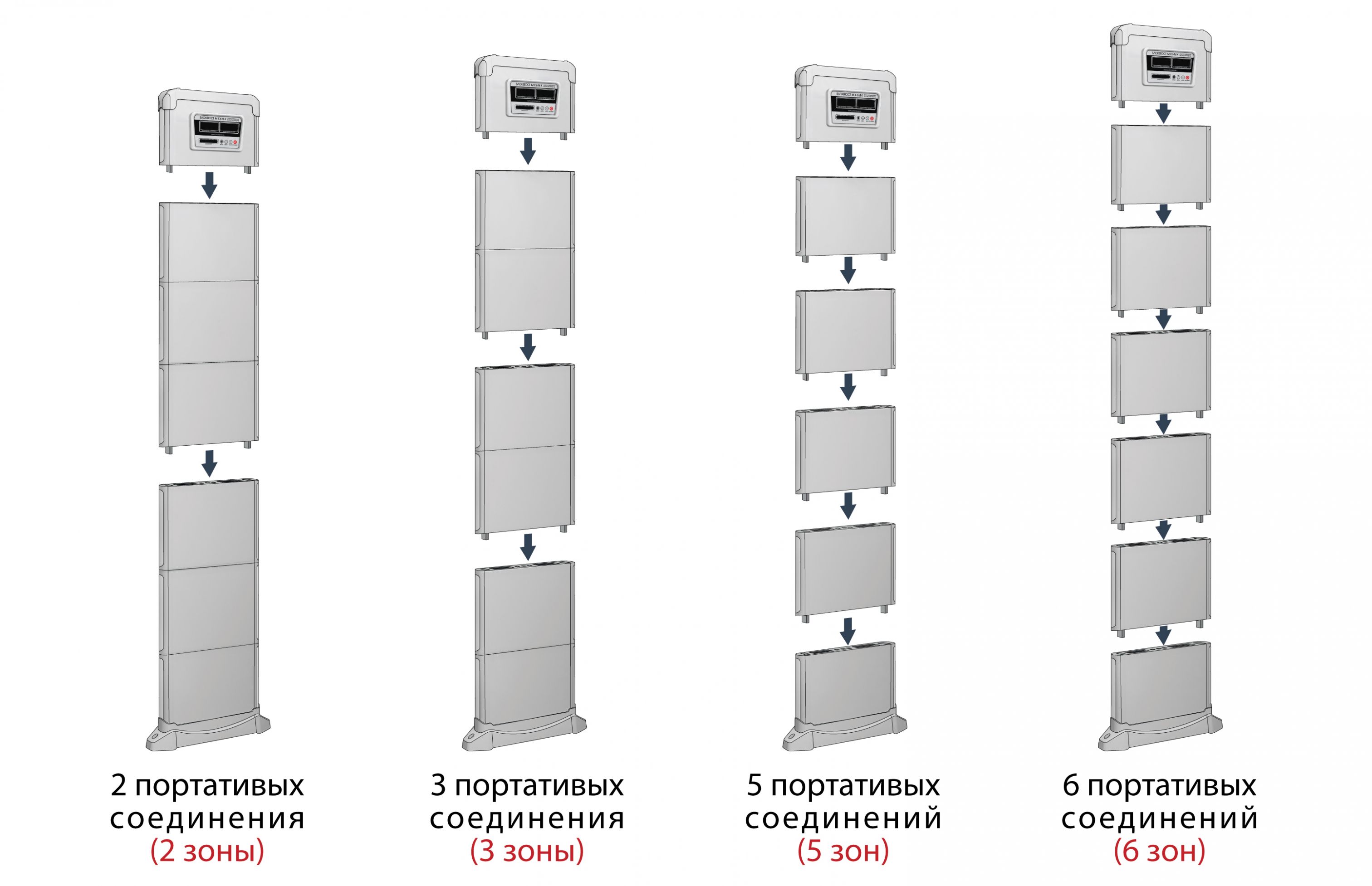 При обустройстве входной группы зоной безопасности детекторы БЛОКПОСТ M X 6 M K можно устанавливать, как параллельно друг другу в одну линию, так и ступенчато. Расстояние между устройствами может изменяться в зависимости от параметров чувствительности монопанелей. Возможность выбора индивидуальной рабочей частоты для каждого металлодетектора, позволяет производить параллельную установку монопанелей количеством до 16 штук в один ряд, исключая помехи от стоящих рядом детекторов. В случае установки большого количества монопанелей в одном месте, рабочая частота подбирается автоматически, благодаря набору готовых программ «быстрой» настройки. Минимально-приемлемое расстояние между детекторами определяется исходя из условий на месте установки.
