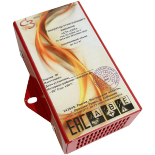 Генератор огнетушащего аэрозольного пожаротушения СТт-100 ГОА-III-0,006-54-5-ТУ 4854-004-38323993-2015 предназначен для локализации и ликвидации пожаров класса А2, В и электрооборудования под напряжением на начальных стадиях развития в условно герметичном объеме распределительных устройствах электросетей и связи, радиорелейных и телефонных ретрансляторах, закрытых двигательных отсеках и грузовых отделениях транспортных средств и т.п.