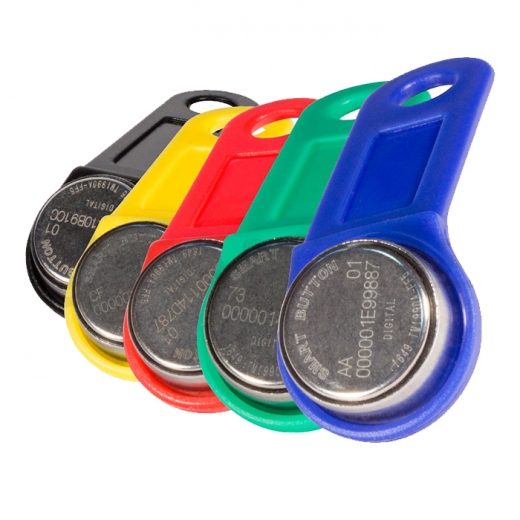 Ключ Touch Memory TM1990A-F5 с пластиковым держателем. Уникальный заводской номер нанесён на металлическую контактную площадку методом лазерной гравировки.