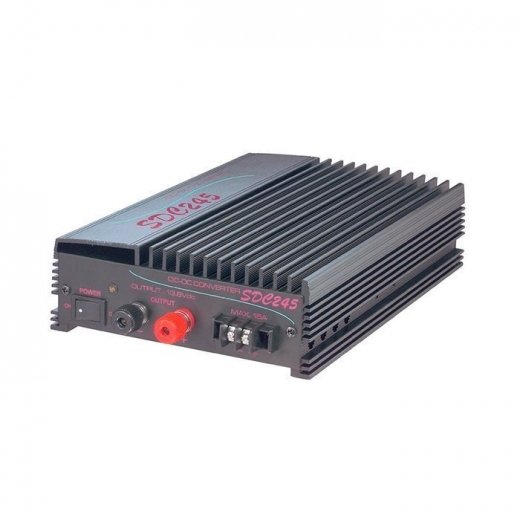 В конвертере SDC-245 напряжение на входе равно 22-30 В, на выходе - 13.8 В, очень хороший показатель КПД - 88%, макс. выходной ток - 45А, конечный ток - 40А.