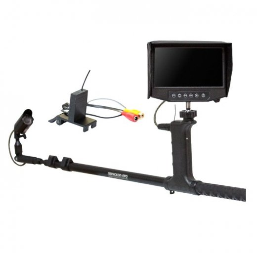- Видеокамера со светодиодной подсветкой размещена на телескопической штанге. Видеосигнал камеры может передаваться на монитор, расположенный прямо на штанге, или видеоочки. Кроме того, беспроводной сигнал может транслировать изображение на телевизор, расположенный в пределах 100 метров от устройства.