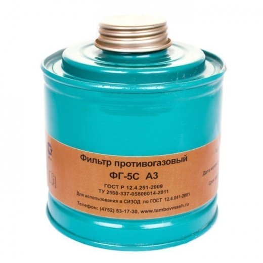 Фильтр к противогазу ФГ-5С (м.A3) используется в составе фильтрующего противогаза ППФ-5С, защищает от нескольких видов вредных веществ различных по концентрации и составам: органических газов и паров с температурой кипения выше 65 С (толуол, бензол, ксилол, циклогексан, бутиламин и др.).