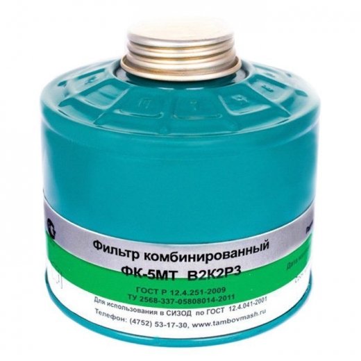Фильтр к противогазу ФК-5МТ (м.B2K2P3) - комбинированный малого габарита "В" (серый), защищает от неорганических газов и паров за исключением окиси углерода (диоксид серы, хлор, сероводород, цианистый водород, йод, , озон, фосген и др.) "К" (зелёный) - аммиак и его органические производные (анилин, дифениламин, хлоранилин, метиламин, бутиламин, этиламин и др.)