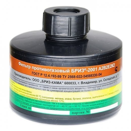 Фильтр противогазовый Бриз-2001 А2В2Е2К2 - предназначен для очистки загрязнённого воздуха от газов и паров органических веществ с температурой кипения выше 65°С (бензол, ксилол, толуол, бензин, керосин, галоидорганические соединения и др.); неорганических веществ (галогены, сероводород, синильная кислота, хлорциан, сероуглерод и др. кроме оксида углерода); кислых газов и паров (диоксид серы, сероводород, хлорид водорода, фосфин, арсин и др.), а также от аммиака и его органических производных.