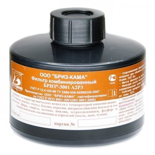 Комбинированный фильтр Бриз-3001 А2Р3 - предназначен для очистки загрязнённого воздуха от аэрозольных частиц малотоксичных веществ, содержащихся в пыли, дыме или тумане, а также от паров органических веществ с температурой кипения выше +65°С (например, бензол, ксилол, толуол, бензин, керосин, галоидорганические соединения, нитросоединения бензола и его гомологов, эфиры, спирты, кетоны, анилин, тетраэтилсвинец, фосфор- и хлорорганические ядохимикаты).