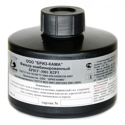 Комбинированный фильтр Бриз-3001 B2Р3 - предназначен для очистки загрязнённого воздуха от аэрозольных частиц, малотоксичных веществ, содержащихся в пыли, дыме или тумане, а также от неорганических газов и паров (например, галогены, сероводород, синильная кислота, хлорциан, сероуглерод), кроме оксида углерода.