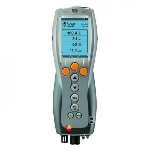 Удобный в использовании, testo 330-1 позволяет осуществлять анализ дымовых газов с помощью двух сенсоров: О2 (0-21 об. %) и CO с Н2-компенсацией (до 8000 ppm) и термопары, установленной в зонд отбора пробы. На основе полученных данных измерений и параметров выбранного вида топлива (доступно 11 видов) прибор автоматически рассчитывает концентрацию CO2, КПД, λ-избыток воздуха, q-потери тепла с дымовыми газами.