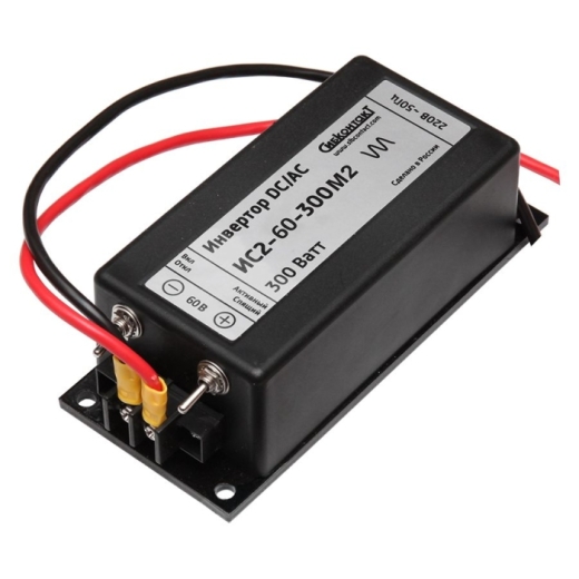Инвертор ИС2-60-300М2 (преобразователь напряжения) преобразует постоянное напряжение аккумулятора 60 В в переменное синусоидальное напряжение 220 В и частотой 50 Гц. Качественные характеристики такого напряжения аналогичны характеристикам напряжения в бытовой сети. Исполнение модификации М2 отличается от серийного исполнения удлиненными входными проводами без разьема типа "крокодил".