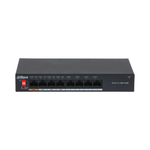8-портовый неуправляемый коммутатор с РоЕ Порты: 4 RJ45 10/100/100Мбит/с (PoE/PoE+/Hi-PoE), 4 RJ45 10/100/100Мбит/с (uplink); мощность PoE: порт 1 до 60Вт, порты 2~4 до 30Вт, суммарно до 60Вт; PoE watchdog, передача до 250м; питание: 48~57В(DC)