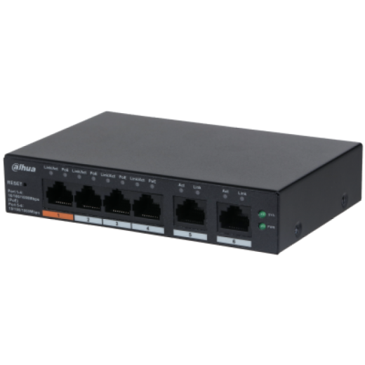 4-портовый PoE коммутатор с функцией облачного управления Порты: 4 RJ45 10/100Мбит/с (PoE/PoE+/Hi-PoE), 2 RJ45 10/100/1000Мбит/с (uplink); мощность PoE: порт 1 до 60Вт, порты 2~4 до 30Вт, суммарно до 60Вт; PoE watchdog, передача до 250м; питание: 53В(DC)