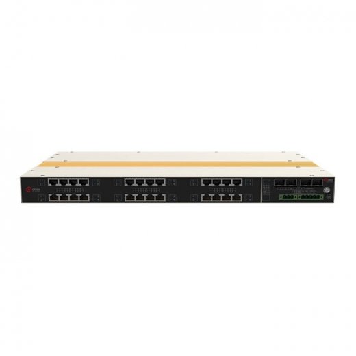 Управляемый индустриальный коммутатор уровня L2+, 24 порта 100BASE-X SFP, 4 порта 100/1000BASE-X SFP, 4K VLAN, 16K MAC адресов, консольный порт, 2 встроенных БП, 90-264В, 18-60В АС-DC, размеры ШхГхВ (440x330x44 мм).