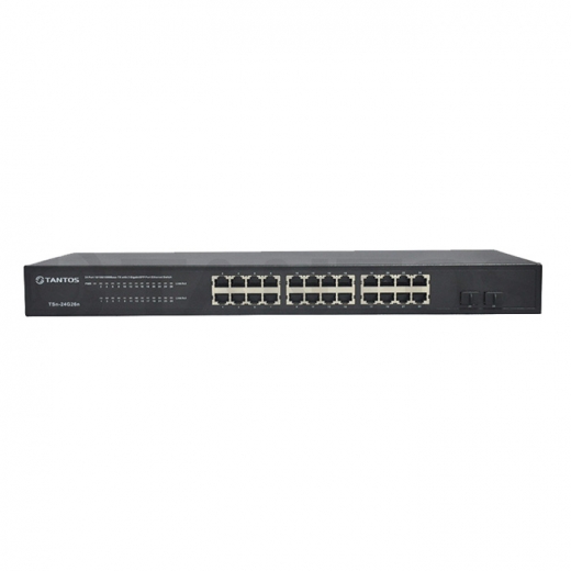 Tantos TSn-24G26n - 24-портовый гигабитный коммутатор, 24 портов 10/100/1000 Мбит/с RJ45+2SFP, дуплекс, общая пропускная способность 52Гбит/с. Протестирован специально для применения в системах видеонаблюдения, исключает потерю пакетов при больших нагрузках. Металлический корпус. БП-встроенный.