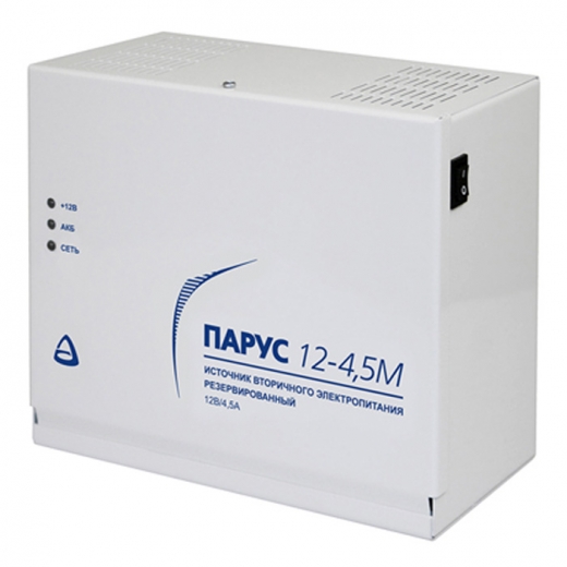 Парус 12-4,5М (Парус-6М) - источник вторичного электропитания резервированный, предназначен для обеспечения бесперебойного электропитания устройств охранно-пожарной сигнализации, камер видеонаблюдения, электромеханических замков и других потребителей при номинальном напряжении 12 В постоянного тока.
