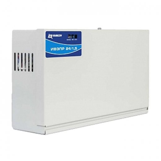 Рубеж ИВЭПР 24/1,5 2х7 БР - импульсный источник питания номинальным постоянным напряжением 24 В и выходным током до 1,5 А.. ИВЭПР 24/1,5 предназначен для стабильного бесперебойного электропитания систем охранной и пожарной сигнализации, пожаротушения, дымоудаления и оповещения. Источник питания выполнен в металлическом корпусе с возможностью установки двух 12-вольтовых АКБ ёмкостью 7 Ач (соединенных последовательно). В схеме ИВЭПР 24/1,5 применён «интеллектуальный электронный ключ», обеспечивающий контроль состояния АКБ и корректировку тока их заряда, что в совокупности с высоким КПД и низким тепловыделением источника обеспечивает полный срок службы АКБ. Отличается высокой надёжностью, расширенным диапазоном сетевого напряжения 130 В - 265 В.