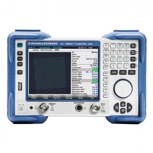 Rohde & Schwarz ETC (8 ГГц) - компактный анализатор телевизионных сигналов, предоставляет широкий спектр измерительных функций для тестирования передатчиков цифрового телевидения DVB-T2, DVB-T/DVB-H и ISDB-T. Он также полезен для ремонта и технического обслуживания ТВ передатчиков, для проверки модуляторов при проведении исследований и разработок или в комплексах для обеспечения качества. Конструкция анализатора идеально приспособлена для измерений покрытия при планировании вещательной сети.