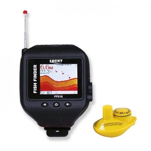 Lucky FF518 - наручный эхолот, сконструирован в форме часов. Материал изготовления – приятный на ощупь высокопрочный пластик. Эхолот часы оснащены цветным экраном, что делает восприятие информации более простым. В комплект входит эхолот и датчик трансдьюсера, забрасывать который можно с побережья, лодки и других плавательных средств, или даже льда на случай зимней рыбалки.