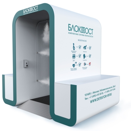 При входе человека в кабину срабатывает датчик движения, и система автоматически запускается, распыляя антисептическое средство для дезинфекции всей поверхности тела.