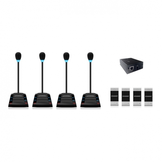 Комплект "клиент-кассир" с системой записи переговоров, 2400 часов на MicroSD карту, сенсорное управление, линейный выход, антивандальная панель, уголок, подсветка микрофона, в комплекте: 4-канальный аудиорегистратор Sprut SR-500/4 + 4 переговорных устройства STELBERRY S-400 + комплект для коммутации + блоки питания