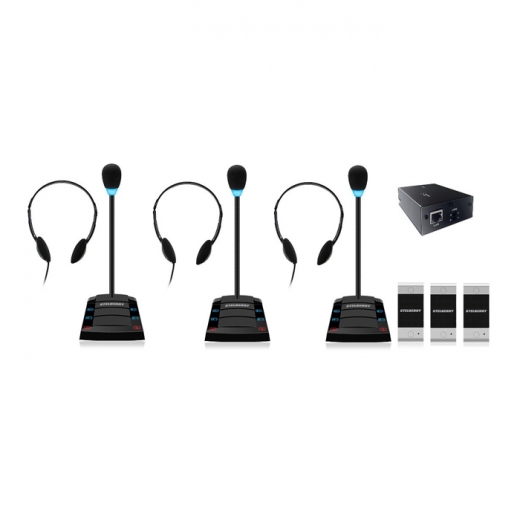 Комплект "клиент-кассир" с подключаемыми наушниками и системой записи переговоров, 2400 часов на MicroSD карту, сенсорное управление, линейный выход, антивандальная панель, уголок, подсветка микрофона, в комплекте: 4-канальный аудиорегистратор Sprut SR-500/4 + 3 переговорных устройства STELBERRY S-400 + комплект для коммутации + блоки питания