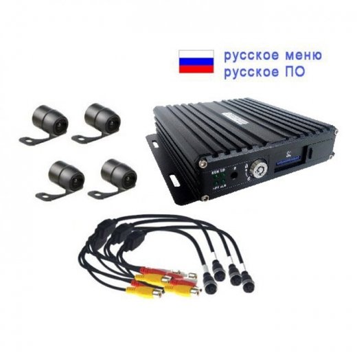 Комплект видеонаблюдения на 4 камеры NSCAR401 3G/GPS/WiFi: 4х канальный регистратор, 4 камеры, микрофон, провода подключения.