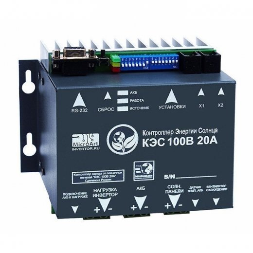 МикроАрт КЭС 100/20 MPPT - солнечный контроллер, рассчитан для работы в фотоэлектрических системах малой мощности при токе заряда до 20 А и напряжении аккумуляторов 12 или 24В (со стороны солнечных панелей напряжение может быть до 100 В). Контроллер обеспечивает функцию слежения за точкой максимальной мощности солнечных панелей.