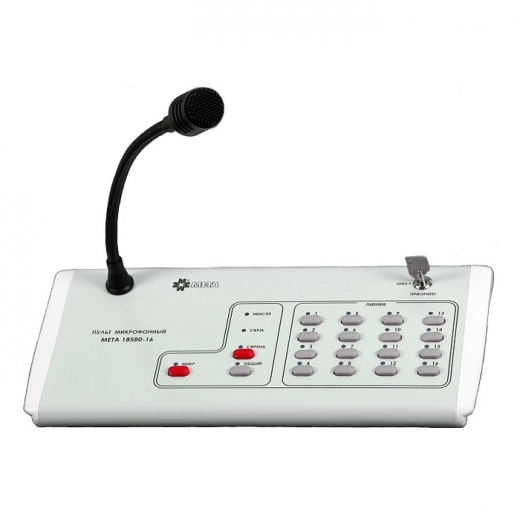 МЕТА 18580-16 - пульт микрофонный (МП) на 16 линий, предназначен для работы в составе системы оповещения, совместно с приборами МЕТА 17820/17821 и МЕТА 19830. МП обеспечивает возможность речевого оповещения от микрофона и подачи сигнала оповещения «СИРЕНА». Удаление микрофонного пульта от прибора оповещения до 500 м. Микрофонный пульт МЕТА 18580 предназначена для работы на столе.