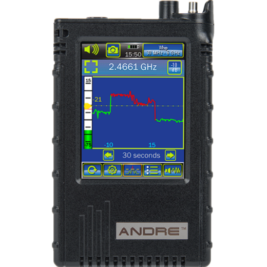 Многофункциональный поисковый прибор АNDRE предназначен для обнаружения источников радиочастотного сигнала в ближней зоне приема. Прибор сочетает в себе широкополосный детектор электромагнитного поля, приемник инфракрасного диапазона, различные дополнительные зонды для проверки проводных линий и оценки виброакустической защиты помещения. ANDRE позволяет выявлять все основные типы устройств негласного съема информации, включая аудио, видео, телефонные, инфракрасные и носимые на теле передатчики. Комплектация прибора имеет широкий набор поисковых зондов и аксессуаров, позволяющих увеличить эффективность поиска. ANDRE является отличным дополнением к спектроанализатору, позволяет провести быструю предварительную оценку радиообстановки.