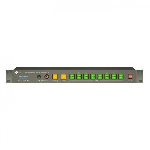 META 9313 - проигрыватель mp3, представляет собой устройство, воспроизводящее дорожки звуковой записи формата mp3, хранящиеся на карте памяти стандарта SD, и предназначен для работы как в составе аппаратных комплексов (Пультах помощника режиссера, радиотрансляционных узлах, системах оповещения и т.п.), так и самостоятельно в качестве источника звукового сигнала трансляции и оповещения.