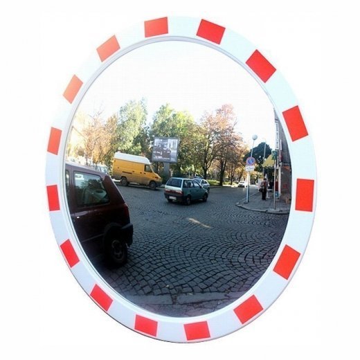 Сферическое зеркало дорожное со световозвращающей окантовкой Ø900 мм используется для безопасности уличного движения. Наиболее часто сферические дорожные зеркала устанавливают: на опасных выездах и поворотах с ограниченной обзорностью, на стоянках и подземных паркингах для облегчения маневрирования во время парковки.