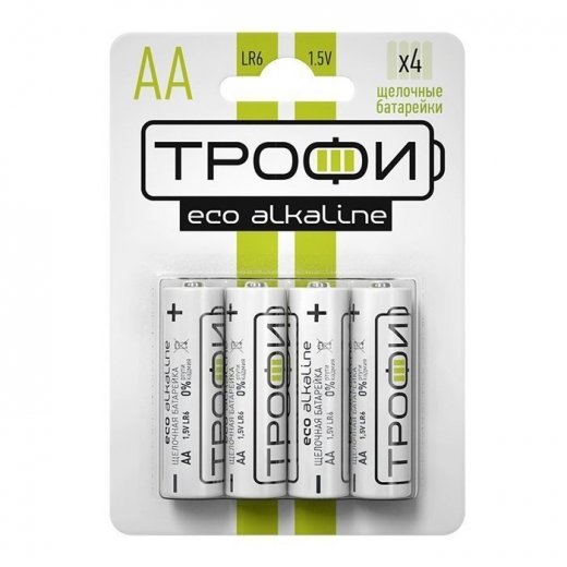 Трофи LR6-4S promo-box (96/384/18432) - экономичная серия щелочных батареек для питания устройств с равномерным и распределенным во времени потреблением энергии: пульты дистанционного управления, простейшие игрушки, светодиодные фонари и др. Классический блистер на 4 батарейки.