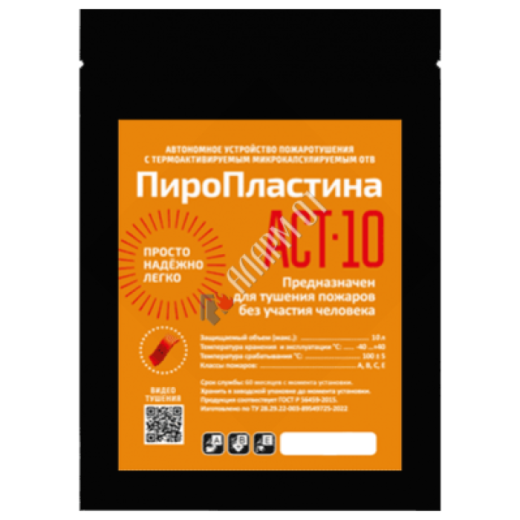ПироПластина АСТ-10 - средство огнетушения, разработанное специально для защиты от возгораний в малогабаритных объектах, таких как электрощитовые, распределительные щитки, электрошкафы, шкафы управления, блоки коммутации, пункты управления, электродвигатели, серверные, сейфы, банковские ячейки, библиотечные хранилища, малогабаритные хранилища ценностей. Размер изделия 50х50х2 мм.