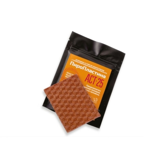 ПироПластина АСТ-25 - средство огнетушения, разработанное специально для защиты от возгораний в малогабаритных объектах, таких как электрощитовые, распределительные щитки, электрошкафы, шкафы управления, блоки коммутации, пункты управления, электродвигатели, серверные, сейфы, банковские ячейки, библиотечные хранилища, малогабаритные хранилища ценностей. Размер изделия 110х65х2 мм.