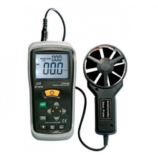 Портативный цифровой термоанемометр DT-619 предназначен для одновременного измерения скорости движения воздушного потока и его температуры, и может применяться, например, для контроля допуска к работе высотного подъемного крана или измерений характеристик систем вентиляции и кондиционирования. Этот термоанемометр позволяет определять скорость перемещения воздуха в диапазоне от 0,4 до 30 метров в секунду с точностью ± 3%, а температуру – от 0°C до 50°C с погрешностью ±2°С.