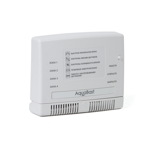 Контроллер предназначен для обработки сигналов от проводных и беспроводных датчиков контроля протечки воды и выдачи управляющих сигналов на исполнительные устройства, перекрывающие подачу воды. Применяется в составе системы управления водоснабжением AquaBast.