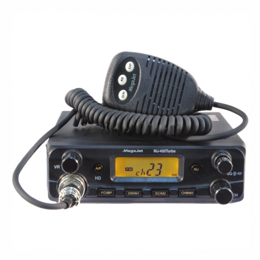 MegaJet MJ-450 Turbo - автомобильная Си-Би радиостанция, выполнена на базе своей предшественницы MJ-450, но имеет повышенную выходную мощность до 20 Ватт. В ней сохранилось всё тоже привычное интуитивно понятное управление, широкая полоса рабочих частот - от 25,615 до 28,305 МГц.