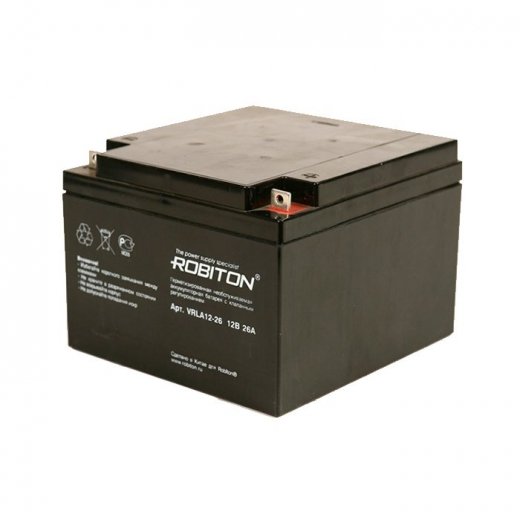 Robiton VRLA12-26 - надежная герметизированная аккумуляторная свинцово-кислотная батарея с технологией VRLA и клапанным регулированием. Данная батарея работает при температуре - 20°С до +50°С, что позволяет ее использовать и в холод и в жару. Она имеет функцию самозаряжения примерно на 2-3% в месяц при комнатной температуре. Технология Absorbed Glass Mat обеспечивает защищенность и надежность от утечки электролита.
