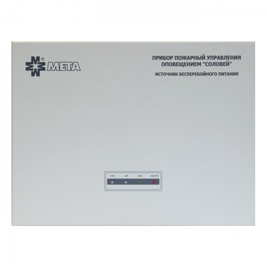 МЕТА Соловей-ИБП - обеспечивает бесперебойное питание блоков Соловей-ЦБ и Соловей-БР от сети 220 В 50 Гц или резервное питания от двух аккумуляторов 12 В, 7-12А/ч.