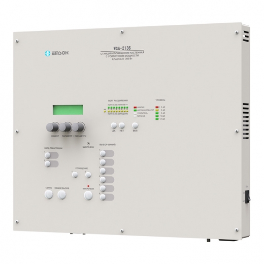 Cтанция оповещения настенная WSA-2136 со встроенным усилителем 360 Вт 100 В на 6 линий предназначена для построения системы оповещения и управления эвакуацией 3,4 и 5 типа, трансляции звуковых программ местного вещания. Станция обладает всеми функциями необходимыми для построения системы оповещения 3 типа на 6 линий и не требует дополнительных устройств, для создания системы 4 и 5 типа необходимо подключить коммутатор световых указателей, имеется возможность увеличения мощности и количества линий системы при подключении модулей расширения WEM. Является полным функциональным аналогом с улучшенными характеристиками настенной станции оповещения СПО-0230Н.